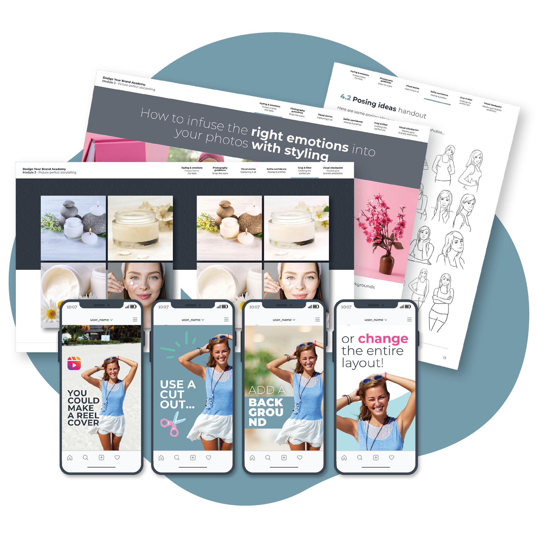 Whether you’re taking a selfie or finding stock photos that work for your brand (or your client’s), this module makes it easy. You’ll get confident in front of the camera & learn exactly how to find or take photos that elevate your brand instantly.