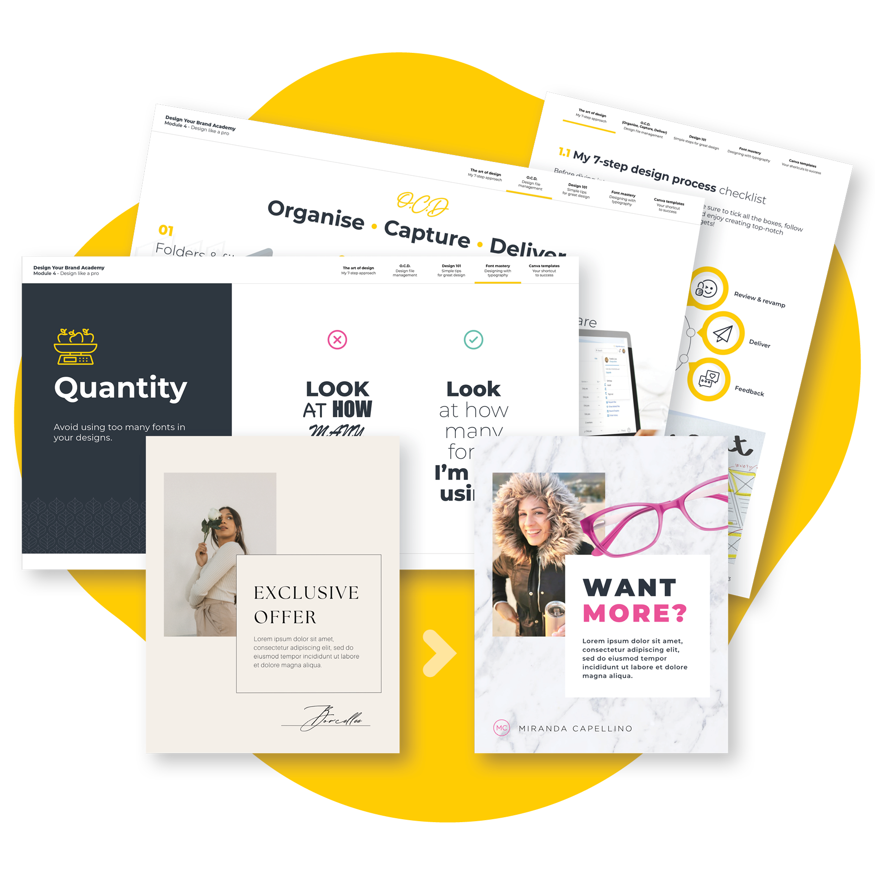 Short, actionable videos (no fluff!) that teach you to think, strategise & design like a pro – even if you’re not naturally creative. These over-the-shoulder tutorials mean you can literally watch me design & follow along.