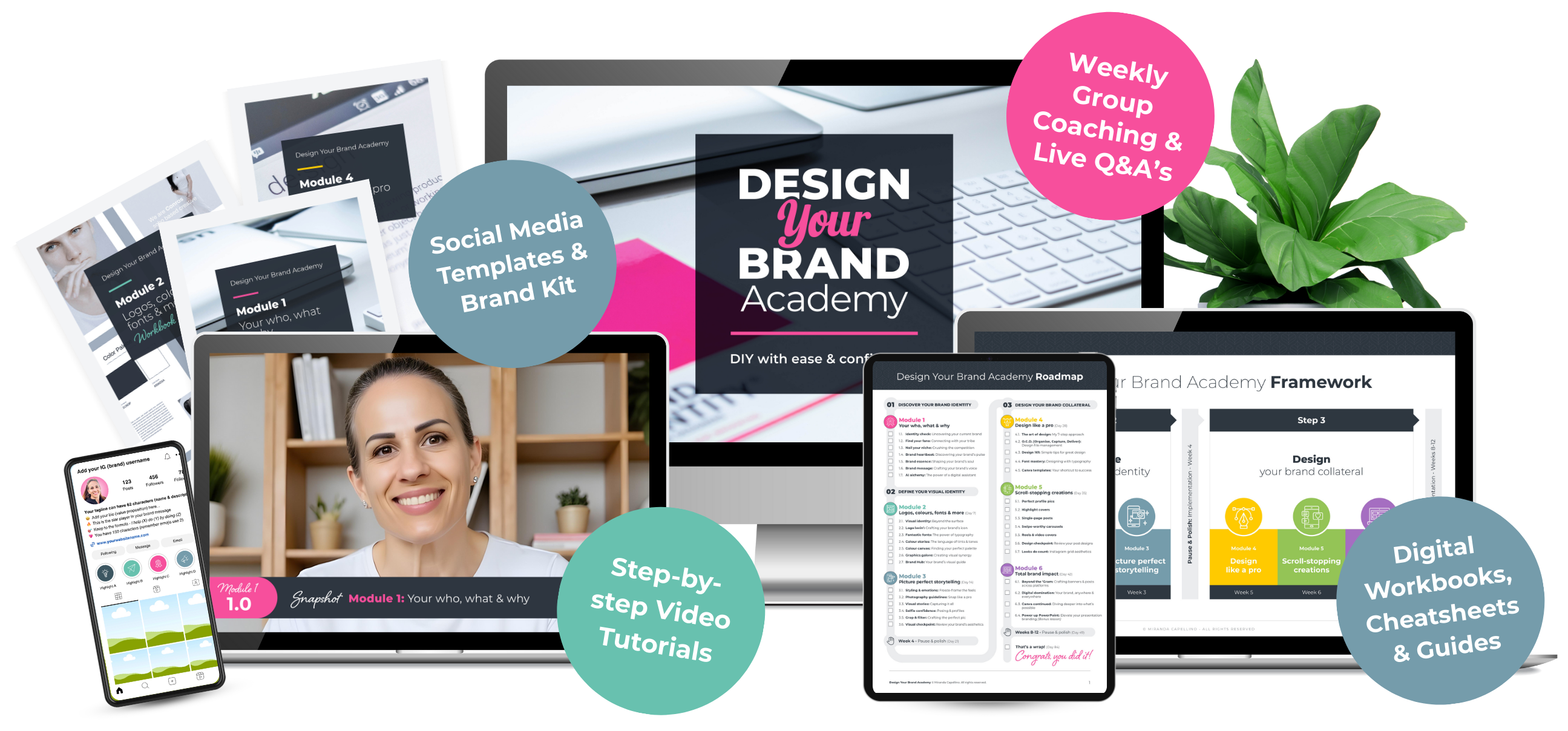 And if you’re just starting, then setting yourself up correctly at the beginning with a strategic brand strategy & visual identity is going to give your business or your client's biz a turbo boost. The principles you'll learn in Design Your Brand Academy will not only make attracting your first fans a breeze but also equip you with a toolkit of templates & resources to nail your future marketing designs effortlessly.